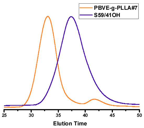Monitoring the synthesis of sample PBVE–g–PLLA #7 via the grafting “from” methodology by SEC.