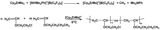 Ethyl vinyl ether (EVE), n-butyl vinyl ether (BVE) and isobutyl vinyl ether (IBVE) have been homopolymerized successfully by employing the system bis(η5-cyclopentadienyl) dimethylhafnium/tetrakis(pentafluorophenyl)borate dimethylanilinium salt Cp2HfMe2/[B(C6F5)4]–[Me2NHPh]+ in quantitative yields. Additionally, statistical copolymers of EVE and BVE have been synthesized successfully [20].