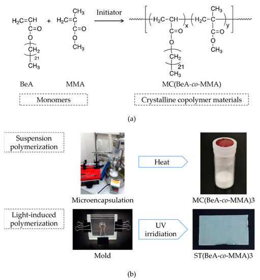 For the crystalline polymers, crystallization controls the assembly of ordered crystalline structures from molecular chains, which determines the basic physical properties of crystalline polymer materials [25]. Therefore, in this paper, we aim to investigate the phase transition behavior between the crystal phase and the isotropic phase of the thermal-energy-storage copolymer materials with a crystalline n-behenyl side-chain. A series of copolymer microcapsules were synthesized from BeA and MMA, shorted as MC(BeA-co-MMA). Polymethyl methacrylate (PMMA) is a tough and rigid plastic having pendent methyl groups (–CH3), which prevent the polymer chains from rotating freely around a carbon–carbon bond and packing closely in a crystal pattern. The introduction of MMA would change the chain flexibility and segment motion. Moreover, copolymer sheets with the same ingredients as copolymer microcapsules, shorted as ST(BeA-co-MMA), were synthesized as comparison samples through light-induced polymerization [20]. The synthesis schemes of the MC(BeA-co-MMA) copolymer are shown in Figure 1a, and the microcapsules and sheets prepared through suspension and light-induced polymerization, respectively, are presented in Figure 1b. The effects of monomer ratio and synthesis method on the crystal transition behavior and thermal properties were studied.