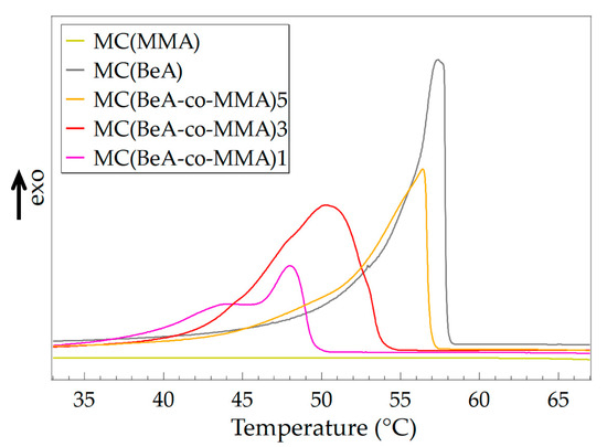 DSC curves of MC(BeA-co-MMA) copolymer microcapsules and MC(BeA) in the cooling process measured at a cooling rate of 5 °C·min–1.