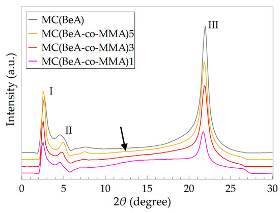 SAXS patterns of MC(BeA-co-MMA) microcapsules and MC(BeA) measured at room temperature. Three diffraction peaks were shown for both MC(BeA) and MC(BeA-co-MMA).