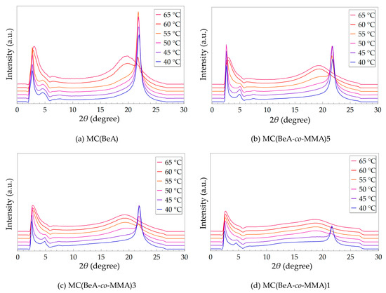 MC(BeA-co-MMA) microcapsules exhibit a complicated transition behavior between the isotropic phase and crystal phase. A temperature variable SAXS of MC(BeA-co-MMA) microcapsules and MC(BeA) were carried out in the cooling process at a slow rate of 0.5 °C·min–1 from 70 to 35 °C shown in Figure 4. In order to give a clear understanding and a direct comparison, the scale of intensity of each diagram is set to the same. The higher intensity and smaller half-peak width indicates a better crystal pattern with fewer disturbances from the main-chain skeleton [17,35]. For MC(BeA-co-MMA)5 and MC(BeA-co-MMA)3, the strong diffraction peaks suggested good crystallization properties, which ensured the high phase change enthalpy and good energy storage capacity. In our previous work, an infrared thermal testing was used to evaluate the thermoregulation property [18,20]. Owing to the good crystallization property, MC(BeA-co-MMA)5 and MC(BeA-co-MMA)3 effectively prolonged the time to reach the setting temperature, showing the huge capacity to store thermal energy.