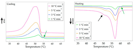 The regularity of the repeating units strongly affects the crystal transition behavior of MC(BeA-co-MMA) microcapsules. DSC tests of MC(BeA-co-MMA)3 measured at different cooling/heating rates, including 1 °C·min–1, 3 °C·min–1, 5 °C·min–1 and 10 °C·min–1, were used to evaluate the crystal transition behavior. The relative DSC curves are shown in Figure 5, and the detailed data of the phase change temperature and phase transition enthalpy are listed in Table 4. In the temperature range of 40 to 60 °C, MC(BeA-co-MMA)3 displayed a different crystal transition behavior at various temperature changing rates. With the temperature changing rate increasing from 1 °C to 10 °C, the crystallization temperature tended to decrease; the same trend also for phase change enthalpy. On the cooling curve of MC(BeA-co-MMA)3 at the temperature changing rate of 1 °C·min–1, a small peak at 55 °C was detected, along with the corresponding endothermic peak at 60 °C in the heating process (indicated by the green arrows in Figure 5 (left) and Figure 5 (right), respectively). These peaks were not detected any more under the condition of a faster temperature changing rate. According to the XRD result of MC(BeA-co-MMA)3 shown in Figure 4c, the initial phase transition temperature of the crystalline n-behenyl side-chains was the same around 55 °C. The introduction of a tough and rigid PMMA segments reduced the flexibility of the copolymer chains and the mobility of the crystalline side-chains, and made the copolymer harder to form a crystal. On the heating curves of MC(BeA-co-MMA)3 at a higher temperature changing rate, a small shoulder endothermic peak was observed below the melting point (indicated by the black arrow in Figure 5 (right)). It revealed the existence of a metastable crystal forming below melting point with a faster cooling process. Melting of a remaining metastable crystal form occurred at a temperature near 48 °C, and then melting of the most stable form occurred.