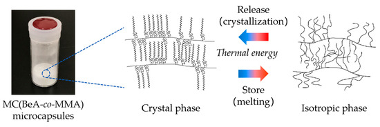 Polymeric PCMs transform from one semi-crystalline state into another semi-crystalline state, or an amorphous state, with the advantages of small volume change, high energy-storage density, great design flexibility and form-stable at a temperature above the melting point [7,8,9]. Polymeric PCMs also benefit from less phase segregation and good physical-chemical stability. These features give them perfect thermal durability and cycling stability against thermal degradation required for a long-term service [10,11,12,13]. Comb-like polymers, with a crystalline long n-alkane side-chain attached to a main-chain, are known to pack into a layered structure with alternating side-chain crystal regions at room temperature [14,15,16,17]. In our group, much of the work revolves about crystalline copolymer microcapsules and gels having a chemical structure with an n-alkane crystalline side-chain. The behenyl acrylate (BeA) consisted of an n-behenyl chain with 22 methylene units and a vinyl group was used as the phase change monomer to synthesize P(BeA-co-MMA) copolymer microcapsules with methyl methacrylate (MMA) through suspension polymerization [18]. Furthermore, we have developed crystalline gels with high toughness and high flexibility, as well as other functions such as shape memory, humidity regulation, thermal expansion and thermal energy storage [19,20,21,22,23,24]. We have confirmed that these copolymers can form crystal regions at room temperature to provide thermoregulation properties, and their application potential as form-stable solid–solid PCMs are greatly expected.