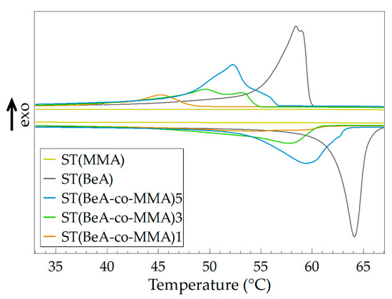 By adjusting the monomer ratio of the copolymer, microcapsules with varying phase transition behavior and thermal properties can be prepared. Using copolymer microcapsules and sheets with the same ingredients as samples, we investigated the effects of synthesis method on the thermal and crystallization performance of the copolymer materials. Monomer BeA and MMA can form copolymer sheets under UV irradiation through free-radical light-induced polymerization. The DSC curves of ST(BeA-co-MMA) copolymer sheets are shown in Figure 7, and the detailed data are listed in Table 5.