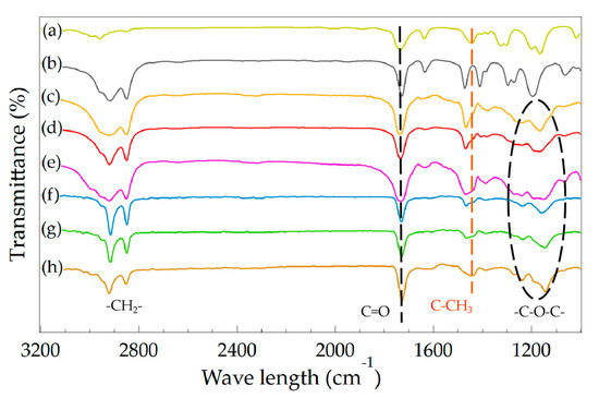 FTIR spectra of microcapsule and sheet samples for BeA-co-MMA copolymer and monomers MMA and BeA. (a) MMA, (b) BeA, (c) MC(BeA-co-MMA)5, (d) MC(BeA-co-MMA)3, (e) MC(BeA-co-MMA)1, (f) ST(BeA-co-MMA)5, (g) ST(BeA-co-MMA)3, and (h) ST(BeA-co-MMA)1.