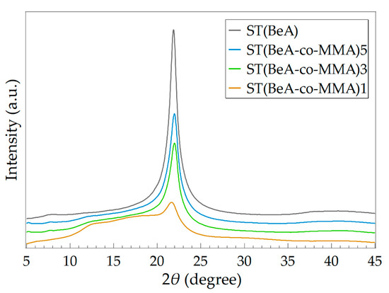 Wide-angle X-ray scatting (WAXS) patterns of ST(BeA-co-MMA) copolymer sheets and homopolymer ST(BeA) measured at room temperature.