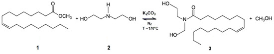 The synthesis of oleic acid diethanolamide (OADA) was performed by the esterification reaction of methyl oleate (1) with diethanolamine (2) in a 1:3 ester:amine molar ratio, as shown in Figure 1 and described in the literature [17,28]. Under nitrogen atmosphere, the system was heated until it reached 170 °C and then, 5 (w/w) % of catalyst (K2CO3) were added. After that, it was refluxed for 8 h at 170 °C under constant magnetic stirring.