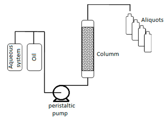 To ensure that the prepared nanoparticles suspensions could be transported through a porous medium, their transport and adsorption behavior were analyzed by experiments in an unconsolidated sand porous medium column test. The porous medium was constructed in a liquid chromatography column (diameter 2.5 cm, length 15 cm), filled with sand and sealed with two PTFE (polytetrafluoroethylene) end fittings, connected to a peristaltic pump (Masterflex® L/S peristaltic pumps, Cole-Parmer, Vernon Hills, Illinois, USA). The test consists of subsequent fluid injections in the column: 1 pore volume (PV) of distilled water, 3 PV of surfactant solution or nanoparticle suspension and finally 3 PV of distilled water. The concentration of the active substance (surfactant or nanoparticle) in the injected fluid was 0.1 (m/v) %, and the pumping flow rate was 0.1 mL/min. During the experiment, every ten ml of effluent were collected and analyzed by TOC detection for the surfactant-only injections or by UV–Vis spectrophotometry at 400 nm in the case of nanoparticles injection. The active substance content in the effluents allowed to plot the breakthrough curves, i.e., the relative concentration C/C0 (C—concentration in the effluent and C0—initial concentration injected) as a function of the pore volume [11,33]. Besides, to evaluate the content of adsorbed material in the medium, a graph of cumulative content recovered versus the pore volumes injected was obtained.