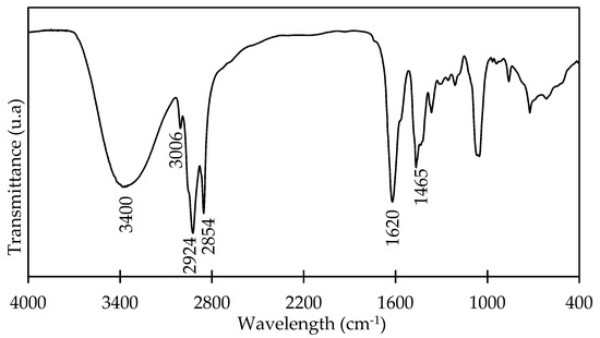 The FTIR spectrum for OADA is shown in Figure 3. A broad-band at 3400 cm−1 was attributed to stretching modes of OH group of alcohol and a band at 1065 cm−1, for stretching modes of C–O bond of primary alcohols. The stretching vibrations of amide carbonyl were observed at 1620 cm−1 and C–N stretching at 1465 cm−1. Asymmetrical and symmetrical stretchings of –CH2 and –CH3 of long chain fatty acid appeared at 2924 and 2854 cm−1, respectively. The disappearance of –NH– angular vibration at 1550 cm−1 confirmed an efficient elimination of amine species that were used in excess in the reaction.