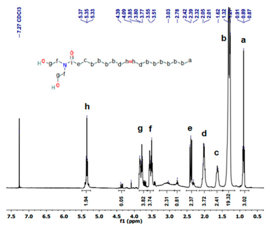 The 1H NMR spectra of OADA is displayed in Figure 4, where some characteristic peaks were identified: Terminal proton (a) of –CH3 at δ = 0.89 ppm, –CH2 proton (b) present in the long fatty chain at δ = 1.27 ppm, –CH2 proton (e) adjacent to amide –C=O observed at δ = 2.4 ppm, proton (g) of –CH2 near hydroxyl appeared at δ = 3.9 ppm, proton (h) of –C=C– of unsaturated fatty acid chain at about δ = 5.35 ppm and the peak at about δ = 3.53 ppm is assigned to -CH2 adjacent to amide nitrogen. These peaks were also confirmed in the literature [28,35].