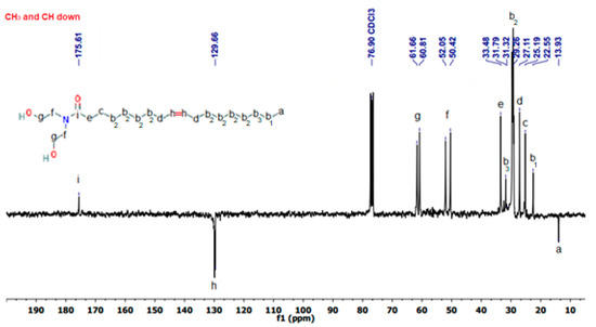 Figure 5 shows the 13C NMR spectrum of OADA, using attached proton test (APT) technique, and the structure obtained by 1H NMR analysis was confirmed by the results from 13C NMR. The characteristic peak of –CH3, present in the ester methyl group (methyl oleate), which was used as a reagent, was not present, and that confirms the completion of the reaction.