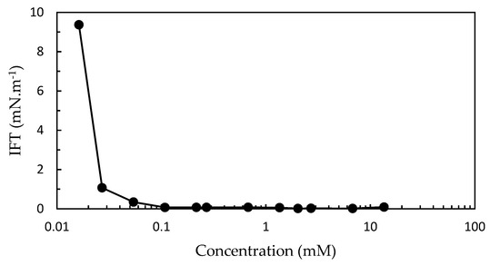 It was observed that at very low OADA concentrations occurred a drastic IFT reduction when compared to water/mineral oil interfacial tension (12.6 mN·m−1), which is in accordance with other surfactants previously studied [37]. At a concentration of 0.10 mM (IFT = 0.070 mN·m−1), the curve seems to have reached an equilibrium plateau, although greater concentrations still caused a discrete IFT decrease until reaching a minimum at 0.017 mN·m−1 for the solution containing 2.0 mM of OADA.