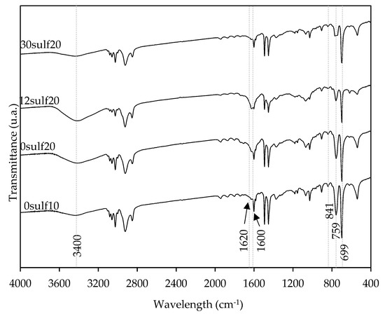 FTIR and PCS analyses were performed to investigate the presence of surfactant and sulfonate functional groups in the synthesized nanoparticles polymer structure, and their influence on the nanoparticles′ particle size. Figure 8 shows the FTIR spectra for: 0sulf10, 0sulf20, 12sulf20 and 30sulf20 nanoparticles.