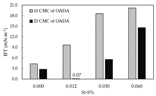 In addition, taking into consideration that the substitution of styrene monomers by sulfonated styrene causes a reduction in particle size (as shown in Figure 9), it could be expected a higher interfacial activity for these systems, since they show greater area/volume ratio. Low concentrations of St-S favor the reduction of interfacial tension, because smaller nanoparticles are more effective in displacing other molecules at the interface [16]. However, at higher sulfonate group concentrations, this tendency is not observed. The nanoparticles become more soluble in the aqueous medium to such an extent that they do not migrate to the water/oil interface any longer. Therefore, the number of active substances (nanoparticles + surfactant system or free nanoparticles or free surfactant molecules) at the water/oil interface is reduced, increasing the interfacial tension. Considering a balance of these factors, it was determined which system would be derived from the optimized conditions. The system that showed minimal particle size and interfacial tension in the range of ultra-low IFT was the one synthesized with 0.012 mol % St-S content and an OADA concentration of twenty times the CMC.