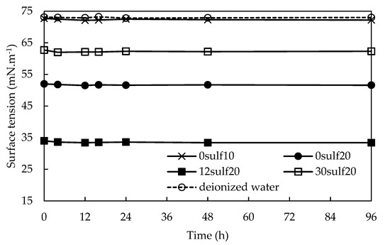 In order to better evaluate if the prepared systems could be applied as surfactant-controlled release nanocarriers, surface and interfacial tension measurements were performed to evaluate their dependence with time. For that, suspensions containing 0.1 (m/v) % of 0sulf10, 0sulf20, 12sulf20 and 30sulf20 nanoparticles were prepared and surface tension values were collected until they reached an equilibrium. Then, this property was monitored over the first 96 h, as revealed in Figure 11. As expected, the surface tension values for all samples did not present any significant variation, meaning that a premature surfactant loss in the aqueous phase during an EOR process would be negligible. This can be explained by the existence of hydrophobic interactions between the polystyrene chains and the oleic acid diethanolamide molecules, especially through their long fatty chain, that turns difficult their release in a polar medium. In other studies by our Group [17], it was achieved similar results using nonionic surfactants in mesoporous silica systems.