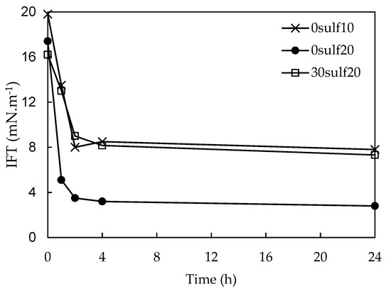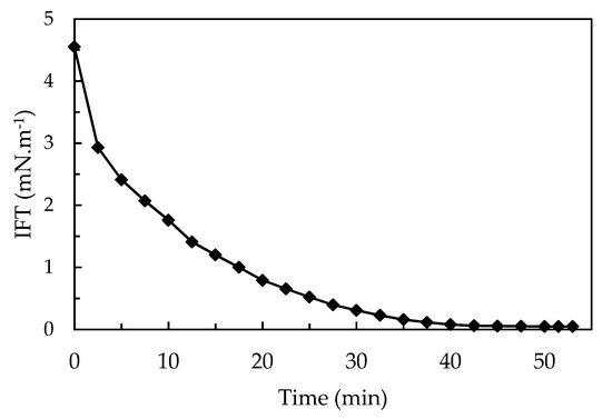Afterwards, these aqueous systems were placed in contact with oil to proceed with the interfacial tension (IFT) measurements. Figure 12 shows a typical L-shape where an IFT reduction occurs during the first two hours of analysis and, after that period, the variations were not relevant. Freitas et al. [17] and Rosestolato et al. [14] identified a similar behavior in which the IFT decreased gradually during the first hours probably due to the migration of the surfactant molecules away from the nanoparticles to the water/oil interface where they replace the solvent molecules until the IFT reached an equilibrium plateau. The system containing 12sulf20 nanoparticles readily reached IFT values lower than 1.0 mN·m−1 when it was measured by the Du Nouy method. Since the Du Nouy method is not able to measure values below 1.0 mN·m−1, the IFT measurements for the 12sulf20 system were carried out in the spinning drop tensiometer and the results are displayed in Figure 13.