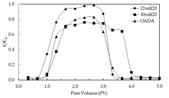 The analysis of the Breakthrough curves (Figure 15) shows that the systems have different elution profiles. The free surfactant (OADA) concentration at the plateau did not reach the initial concentration of the injected system, which means that a fraction of it was retained on the porous sand surface. In the nanoparticles’ fluids curves, it is noted that the lower the sulfonate group content in the nanoparticles, greater was its percolation capacity in the porous medium. In the same way as it was observed for the curve related to the OADA solution, the concentrations of the 30sulf20 nanoparticle suspension at the plateau was inferior to the injected concentration and also showed a delay in its elution from the porous medium, similar to a tail [64], probably as a consequence of its larger particles size (132 nm). Differently, the 12sulf20 nanoparticle curve has reached the plateau rapidly due probably to both these factors: Its particle size (66 nm), which is almost a half of 30sulf20 nanoparticles size, which favors its permeation through rock pores, and its lower sulfonate group content which may have contributed to decrease its interaction with the sand.