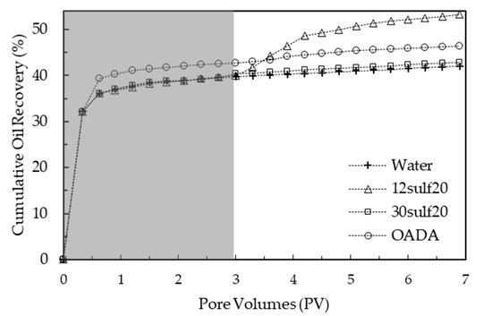 Figure 16 shows the comparison between the oil recovery curves for the systems based on deionized water, OADA surfactant solution and nanoparticles suspensions. The shaded area is related to the secondary oil recovery, i.e., water flooding.