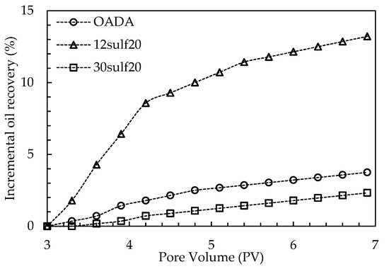 The water flooding process produced a recovery in the range of 40–46% of the original oil in place in the same way as reported by other studies using sandstone as a porous medium [11,32,34]. In order to better discuss the system′s performance, Figure 17 displays the incremental oil recovery results from the chemical flooding stage, i.e., considering only the pore volumes injected after the secondary oil recovery.