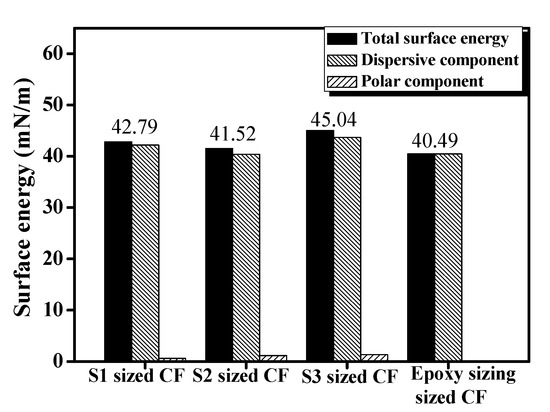 In CF/UPR composites, the wettability between CF and resin directly determines the mechanical properties of the composites [30]. Wettability depends mainly on the surface energy of CF and the surface tension of the resin. The dynamic contact angles of SC1, SC2, and SC3 with water and diiodomethane were measured. According to Owens-Wendt-Rabel-Kaelble (OWRK) and Young’s equation, we can get the surface energy of sized CFs [31]. It can be seen from Figure 9 that the surface energy of sized CF by S1, S2, S3 and commercial epoxy sizing ranges from 40 to 45 mN/m. The S3 sized CF, in particular, shows the highest surface free energy (45.04 mN/m), and as a result, has produced the most favourable wetting conditions.