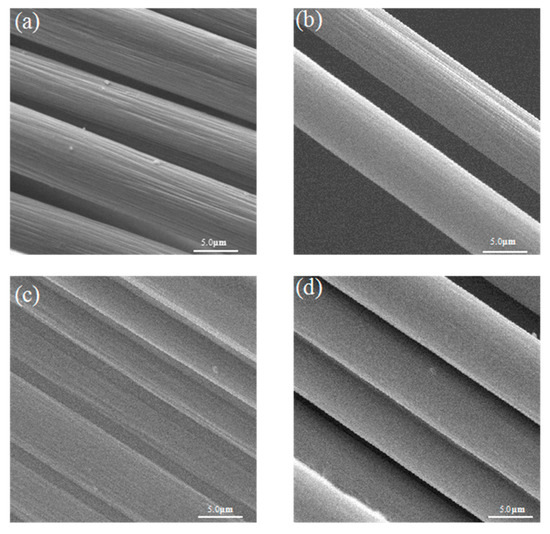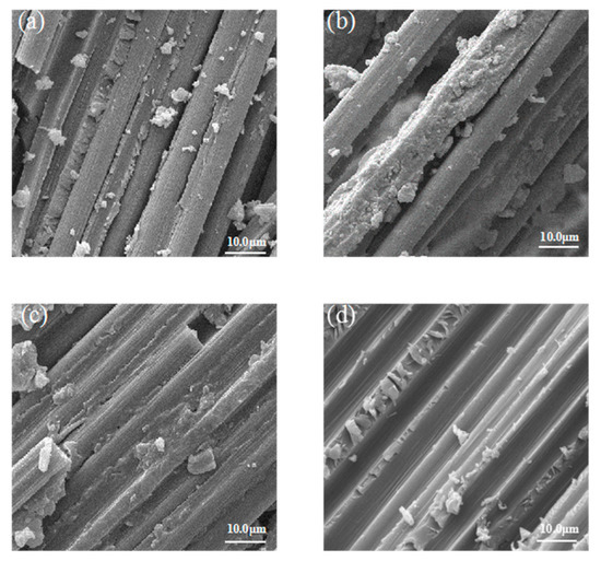 The surface morphologies of unsized CFs and CFs sized by S1, S2, and S3 were investigated by SEM. In Figure 10, image (a) is for unsized CFs, there are many narrow parallel grooves distributed along the longitudinal direction of the fiber. In contrast, surface morphologies of CFs sized by S1, S2 and S3 change remarkably. The surfaces of CFs were impregnated with a protective layer, which effectively changed the surface morphology of the fibers, and some grooves had been filled up, allowing the CF to bond with the resin firmly.