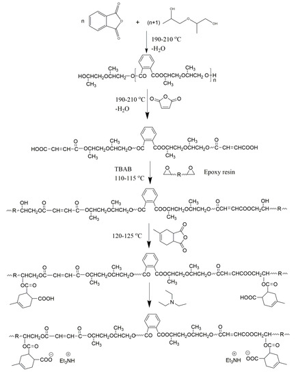 Typically, for S1, phthalic anhydride (144.34 g, 0.975 mol) and dipropylene glycol (160.92 g, 1.199 mol) were placed into a 500 mL four-neck flask. The mixture was heated at 210~240 °C until the acid number of the mixture decreased to 5 mgKOH/g. Then, the mixture was cooled down to a temperature of 30 °C and maleic anhydride (29.4 g, 0.3 mol) was added. The temperature was increased again to 220 °C until the acid number dropped to 38 mgKOH/g and was left to cool down to 30 °C. Epoxy resinE-51(34.96 g) and TBAB (0.35 g, 0.001 mol) were then added and the reaction was continued up to 115 °C until the acid number was less than 5 mgKOH/g. Later, methyl tetrahydrophthalic anhydride (29.86 g, 0.18 mol) was added for further esterification reaction and the generation of carboxylic acid groups simultaneously. Finally, the S1 was obtained by adding TEA (18.18 g, 0.18 mol) and deionized water. The detailed synthetic route of S1 is given in the following Scheme 1. Compared to S1, S2 made by using adipic acid instead of phthalic anhydride, and S3 was synthesized in the same way as S2 but with neopentyl glycol to replace dipropylene glycol. The yields of S1, S2, and S3 are 80%, 79%, and 78%, respectively.