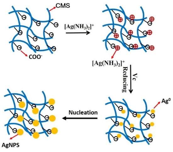 When mixed with water, the CMS will form a gel because of the abundance of carboxyl groups on the surface of the CMS. The negative charge, such as that caused by carboxyl groups, can attract a positive charge [Ag(NH3)2]+ toward its polymer chains. Then the [Ag(NH3)2]+ around the carboxyl group was reduced in the presence of the reducing agent Vc and nucleated silver nanoparticles (Figure 1). The concentration of nano-silver is about 10−4 M in CMS/AgNPs colloidal solution. Furthermore, the UV–VIS spectral responses of the CMS/AgNPs were recorded at different pH in Figure S1. The pH of the synthesized CMS/AgNPs sol is 8.39. The CMS/AgNPs shows no noticeable effects with the change in pH from 6.59 to 10.51. However, the CMS/AgNPs shows spectral changes at low pH (<2.48) due to the COO− in the CMS combined with H+ to form COOH, which reduced the stabilizing of AgNPs. These results confirm that CMS can stabilize AgNPs because of electrostatic adsorption between COO− and [Ag(NH3)2]+.