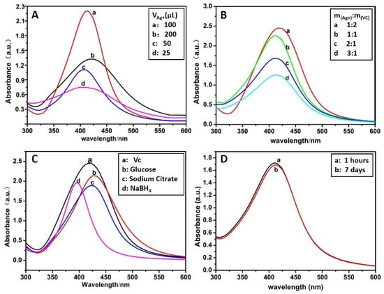 UV–VIS spectra of CMS/AgNPs: (A) Different volumes of Tollens’ reagent (0.1 M), (B) different proportion of VC, (C) different reducing agents, and (D) reduction stability of Vc.