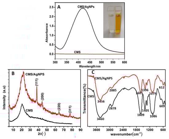UV–VIS spectra demonstrated that AgNPs displayed a strong characteristic absorption peak within the visible region from 410 to 430 nm by comparing to CMS. The maximum absorption peak was located at 420 nm (Figure 3A) and the CMS/AgNPs colloidal solution was transparent yellow (inset, Figure 3A). The XRD pattern of AgNPs is represented in Figure 3B. The 2θ diffraction peaks at 38.10°, 44.26°, 64.61°, and 77.46° were assigned to the (111), (200), (220), and (311) planes of crystallized silver with face-centered cubic (fcc) AgNPs, which suggest that silver nanoparticles were prepared. Figure 3C shows the FT-IR spectra of CMS and CMS/AgNPs. For CMS/AgNPs, the band centered at around 3456 cm−1 can be attributed to the stretching vibration of the hydroxyl group; the band at about 2885 cm−1 is assigned to the C–H group; the band at around 1605 cm−1 is attributed to the stretching vibration of the carboxyl group; the band at around 1396 cm−1 corresponds to the C–H bending mode; the absorption band at 1079 cm−1 is ascribed to C–O–C stretching mode from the glucosidic units; the peak at 612 cm−1 is related to the deformation vibration of hydrogen bond. Figure 3C shows the FT-IR spectra of CMS which is similar to the CMS/AgNPs, indicating that there is no chemical reaction between the formed AgNPs and the CMS.