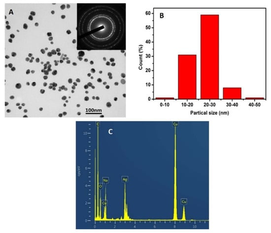 (A) TEM images (inset: SAED pattern), (B) size distribution, and (C) EDS spectrum of CMS/AgNPs.