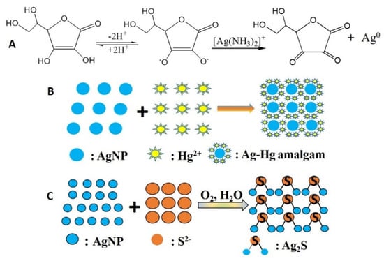 Reaction mechanisms for Vc and Tollens’ reagent (A), reaction scheme of AgNPS and Hg2+ ions (B), and AgNPS and S2− ions (C).