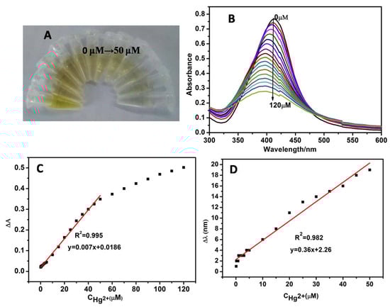 Under optimum conditions, the sensitivity of CMS/AgNPs colloidal solution for Hg2+ was investigated. As observed in Figure 6A, the color of the sensing system gradually faded away with increasing amount of Hg2+ and the color changed to colorless when the concentration of Hg2+ was 50 μM, thus providing a platform for a colorimetric detection of Hg2+ by naked eyes. The absorption peak of AgNPs decreased gradually following the addition of Hg2+ and the maximum absorption wavelength of AgNPs displayed a distinct blue shift (Figure 6B). The reason is that Ag and Hg2+ ions on the surface of AgNPs undergo a redox reaction to form a Ag-Hg amalgam, which caused the reduction of the nano-silver concentration and smaller AgNPs, resulting in a decrease in the absorbance and a blue shift in the wavelength []. In order to analyze the correlation between ΔA and the Hg2+ concentration, the absorption changes with the addition of the ion concentration in the range of 0–120 µΜ were conducted. Based on these data, as shown in Figure 6C, there is a good linear relationship (R = 0.995) between ΔA and the Hg2+ (0–50 μM) concentration, and the LOD for Hg2+ was estimated to be 18 nM. Meanwhile, from Figure 6D, we can see a good linear relationship (R = 0.982) between Δl and the Hg2+ concentration in the range of 0-50 μM and the LOD was approximately 3.3 nM. From Figure S2, we can see that the stronger the reducing ability of the reducing agent, the smaller the average particle size of the synthesized AgNPs. Table S1 shows that the smaller the particle size of AgNPs, the lower the LOD of Hg2+. This phenomenon could be attributed to the high specific surface areas and surface energy of smaller size of AgNPs, when Hg2+ ions were added to the CMS/AgNPs colloid solution, the contact area and reactivity between AgNP and Hg2+ increases along with the size decrease of AgNPs, thus quickening the adsorption and reaction speed. Even at a low concentration of Hg2+, obvious absorbance signals can be obtained in the CMS/AgNPs colloid solution. These results indicated that the small nanoparticles have good sensitivity and lower LOD.