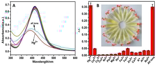 To evaluate the selectivity of CMS/AgNPs colloidal solution, besides Hg2+, 14 other kinds of metal ions, including Cd2+, Co2+, Cu2+, Fe3+, Fe2+, K+, Al3+, Ba2+, Ca2+, Mg2+, Na+, Ni2+, Pb2+, and Zn2+, were selected. The absorption spectra of AgNPs with various metal ions are given in Figure 7A. Comparing these plots, only Hg2+ had a response to AgNPs, and upon the addition of Hg2+, the absorption peak decreased and exhibited an obvious blue shift. For the 14 other metal ions, the absorption spectra were almost unchanged even at the maximum concentration (50 μM). As shown in Figure 7B, the change of ΔA was 0.36 in the presence of Hg2+, but there was no obvious change observed in the presence of other metal ions. The color of the sensing system did not change after the addition of other metal ions (50 μM) except for Hg2+, which made the system change from yellow to colorless (inset, Figure 7B). In addition, in the presence of all anions, the relative absorbance values were analogous to that of the Hg2+ value. These results clearly indicated that other related anions did not interfere with the spectral and colorimetric detection of Hg2+. The experimental results verify that our proposal shows unique selectivity for Hg2+.