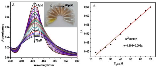 The sensitivity of CMS/AgNPs colloidal solution for S2− was investigated. The absorption intensity of AgNPs decreases gradually along with the addition of S2− (Figure 9A), owing to the formation of Ag2S [,]. Based on Figure 9A, a favorable linear correlation (R = 0.992) can be obtained with the S2− concentration from 15 to 70 μM (Figure 9B), and the LOD for S2− was estimated to be 2.4 × 10−7 M. It can be seen in inset Figure 9A that the color of the sensing system changed from clear yellow to brown with increasing concentration of S2− and, finally, the color changed to colorless when the addition of S2− (70 μM), which provides a platform for a colorimetric method for S2− detection by the naked eyes.