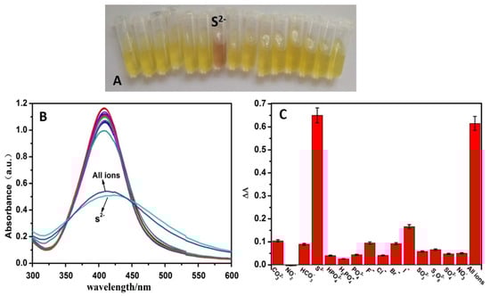 To evaluate the selectivity of this sensing system, 15 kinds various negative ions, such as NO3−, NO2−, CO32−, HCO3−, HPO42−, H2PO4−, PO43−, F−, Cl−, Br−, I−, SO32−, S2O82−, S2− and SO42− ions (50 μM), were added to CMS/AgNPs colloidal solution, respectively. Figure 10B gave the absorption spectra changes of AgNPs after the addition of negative ions. Followed by the addition of S2−, the absorption peak of AgNPs decreased significantly, the ΔA was 0.65 in Figure 10C, with the color changing from yellow to brown (Figure 10A), while there were no obvious changes for other negative ions. In addition, the relative absorbance values were analogous to that of the S2− value in the presence of all anions. These results clearly indicated that other related anions did not interfere with the spectral and colorimetric detection of S2−. These results demonstrate that our proposal shows distinguishing selectivity toward S2−.