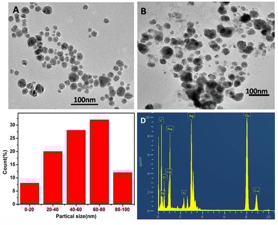 Transmission electron microscopy (TEM) was used to study the nanoparticles’ size and the morphology of AgNPs. It can be seen from Figure 8A that the addition of copper ions had little effect on the morphology of nano-silver. Figure 8B showed TEM images of AgNPs in the presence of Hg2+, the addition of Hg2+ induced the increase in size and the aggregation of nanoparticles, The diameters of the AgNPs were in the range of 50–200 nm and the average particle size was 150 nm, as shown in Figure 8C. EDS showed three peaks in the elemental analysis in Figure 8D, which was consistent with our analysis.