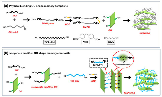 Preparation processes of composites: (a) shape-memory polyurethane (SMPU)/graphene oxide (GO) and (b) SMPU/isocyanate modified GO (iGO).