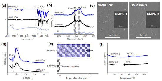 Characterization of the SMPU/iGO and SMPU/GO composites: (a) Fourier transform infrared (FTIR) spectra, in which the gray area indicates the bands at 1740 cm−1 and 1060 cm−1; (b) Raman spectra, in which the gray area indicates the D bands and G bands; (c) morphologies, in which the inserts are the SEM images of their own SMPU matrix—SMPU-1 for the SMPU/GO and SMPU-2 for the SMPU/iGO; (d) XRD results; (e) swelling degree; and (f) differential scanning calorimetry (DSC) results.