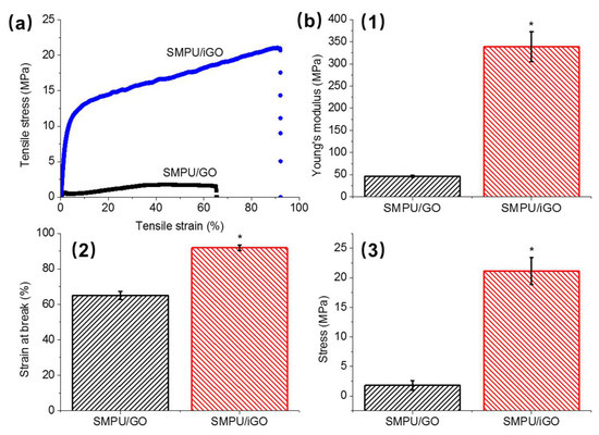 Mechanical properties of the SMPU/GO and SMPU/iGO: (a) tensile curves; (b) Young’s modulus, (1) strain at break, (2) and stress (3) derived from (a); *, significant difference compared to SMPU/GO, p < 0.05.
