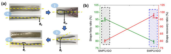 Shape-memory effects of SMPU/GO and SMPU/iGO: (a) Bending test—(1) original angle (θ0 = 0), (2) temporary angle (θm = 1800), (3) fixed angle (θr), and (4) recovered angle (θr); (b) Shape fixity ratios and recovery ratios.