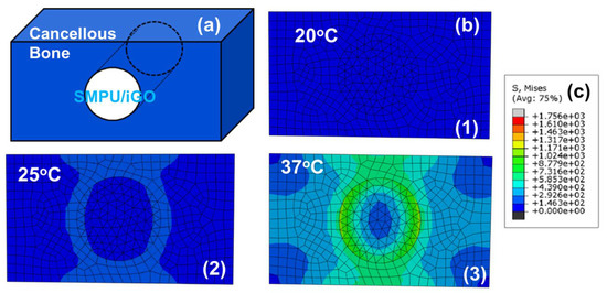 Finite element analysis (FEA) simulation of the SMPU/iGO: (a) the simplified material-bone model; (b) the equivalent stress distribution by FEA during the recovery process at 20, 25 and 37 °C; and (c) the scale of the stress distribution.