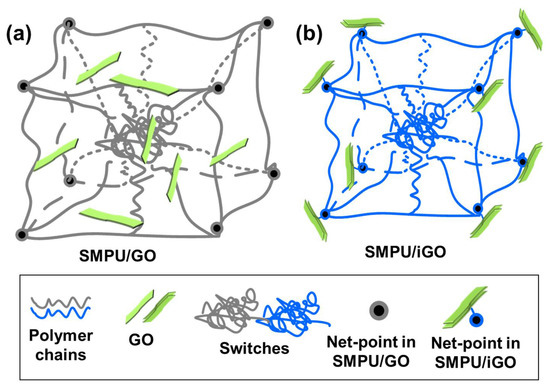 Structural models of the SMPU composites: (a) SMPU/GO, and (b) SMPU/iGO.