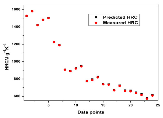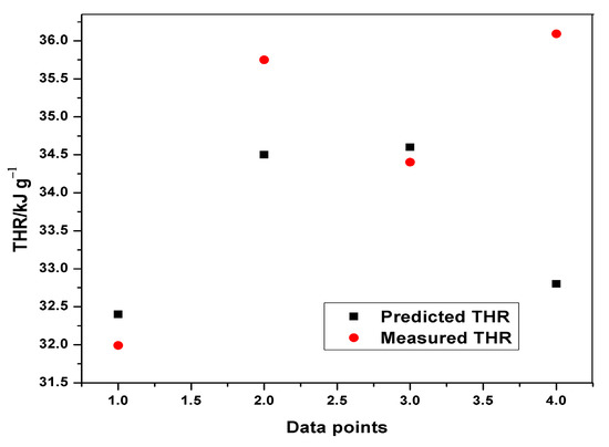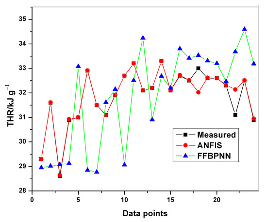 Table 8 indicates the performance of ANFIS models in estimating THR and HRC from the MCC experiment. The basic attributes considered are the adjusted R-squared and the root mean squared errors. It is quite obvious from Table 8 that the RMSEs in all the predictions are less than one, indicating an excellent performance. Although, the training of THR outperformed the other models in terms of prediction errors, no obvious differences can be observed. The learning ability of the developed THR model was more accurate than the generalization one, as shown in the training and testing plots (Figure 9, Figure 10 and Figure 11). Furthermore, the training of the THR model was better than the HRC model, while the test results of HRC outperformed THR. In general, the predictions were in good agreement and fitted the experimental data accurately. Considering the R2 values obtained, one notable conclusion can be made: the model predicted HRC better than THR since both training and testing of HRC had the best results. This is due to the fact that HRC has a direct and significant statistical relationship with the input parameters, whereas THR is almost constant at any given heating rate and sample mass, thus presenting an uneven statistical distribution. It should also be noted that the test results are an indication of the excellent ability of the developed models to predict data beyond the limits of the training range.