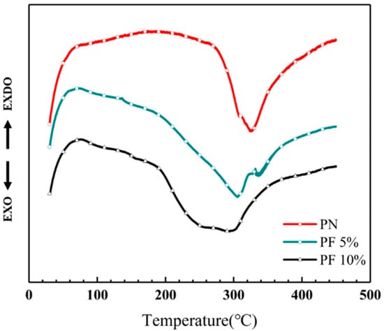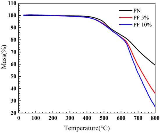 Novolac resin and butanone solution with the weight ratio as 50:50 were put in the same beaker. The mixture was stirred at a constant speed at 50 °C for 10 min until it became uniform transparent liquid. In a three-mouth flask equipped with mechanical stirrer, heater, and thermometer, phthalonitrile resin was heated into melt at 70 °C, and then novolac/butanone mixture was added with constant stirring for 60 min to achieve a homogeneous compound. Considering that the boiling point of butanone is 78 °C, the temperature of the compound was raised to 85 °C for 15 min to remove the residual solvent in the mixture. According to different additive weight of novolac, 5% and 10% mass percent novolac/phenol-containing phthalonitrile blends were obtained. Neat phthalonitrile polymers and those containing novolac at 5 and 10 wt% were cured at 200 °C (1 h), 260 °C (4 h), and 310 °C (5 h). To clarify the relationship between the sample name and composition, the neat phenol-containing phthalonitrile resin is abbreviated PN. The blends are named PF 5% and PF 10% according to their novolac mass fraction of 5% and 10%. All cured resins are prefixed with a “c” before the abbreviation, like cPN, cPF 5% and cPF 10%.