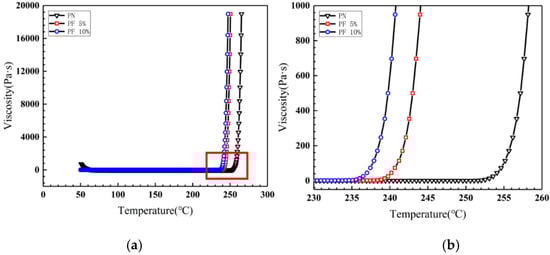 Viscosity vs. temperature plots for novolac/phenol-containing phthalonitrile blends: (a) viscosity vs. temperature cures at variable temperature from 50 °C to 300 °C; (b) local magnification of viscosity vs. temperature cures from 230 °C to 260 °C.