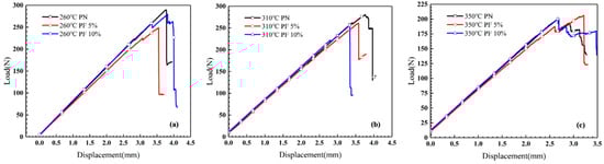 Load–displacement curves of composites bending test with different post-curing temperature and novolac mass percent: (a) 260 °C, (b) 310 °C, and (c) 350 °C.