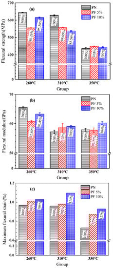 37]. As opposed to a drastic change in flexural strength, the flexural modulus is stable at around 60 GPa. The most prominent characteristic of flexural properties is the enhancement of elongation at bending. For those novolac/phenol-containing phthalonitrile composites post-cured at 350 °C, the maximum flexural strain of 10 wt% novolac addition is 0.93%, 27.35% higher than that of neat phenol-containing phthalonitrile composites (0.73%).