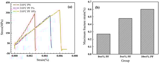 Tensile properties of novolac/phenol-containing phthalonitrile composites post curing at 310 °C: (a) stress–strain curves and (b) maximum fracture strain with different mass percent of novolac.