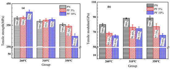 Tensile properties of novolac/phenol-containing phthalonitrile composites: (a) tensile strength; (b) tensile modulus.
